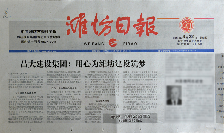 《昌大建設(shè)集團(tuán)——用心為濰坊建設(shè)筑夢(mèng)》——濰坊日?qǐng)?bào)2014年8月22日第二版