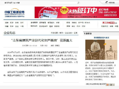 “山東省建筑產(chǎn)業(yè)現(xiàn)代化生產(chǎn)基地”花落昌大——中國工程建設網(wǎng)“企業(yè)動態(tài)”2014.9.28