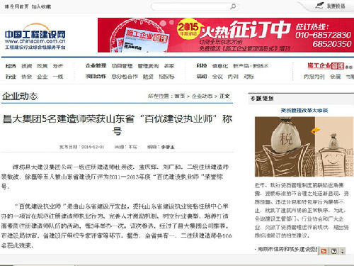 集團(tuán)5名建造師榮獲山東省“百優(yōu)建設(shè)執(zhí)業(yè)師”稱號——中國工程建設(shè)網(wǎng)“企業(yè)動態(tài)”2014.12.0