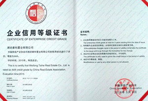 2016年6月24日,中國(guó)房地產(chǎn)信用企業(yè)頒獎(jiǎng)儀式在常州舉行,昌大地產(chǎn)——濰坊泰和置業(yè)有限公司等40家房地產(chǎn)企業(yè)獲評(píng)“全國(guó)房地產(chǎn)AAA級(jí)信用企業(yè)”稱號(hào)。