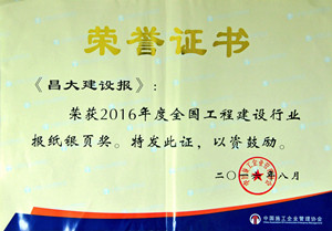 2016年8月5日,中國(guó)施工企業(yè)管理協(xié)會(huì)召開年度通聯(lián)工作會(huì)議,通報(bào)表彰有關(guān)獎(jiǎng)項(xiàng)。集團(tuán)《昌大建設(shè)報(bào)》等63家行業(yè)內(nèi)報(bào)紙獲得“銀頁(yè)獎(jiǎng)”。這也是集團(tuán)連續(xù)多年獲此殊榮。