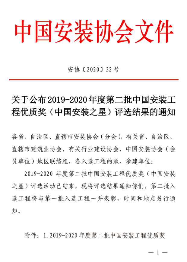 2020年12月10日,中國(guó)安裝協(xié)會(huì)發(fā)布通知,通報(bào)2019-2020年度第二批中國(guó)安裝工程優(yōu)質(zhì)獎(jiǎng)(中國(guó)安裝之星)項(xiàng)目,共222項(xiàng),集團(tuán)安裝公司承建的濰坊市第二人民醫(yī)院門(mén)診病房綜合樓一期(安裝工程)(第144位排序)榮獲該項(xiàng)榮譽(yù)。這也是集團(tuán)建司以來(lái)首次參評(píng)并獲該項(xiàng)榮譽(yù)。據(jù)悉,該批次入選項(xiàng)目由272家會(huì)員企業(yè)擇優(yōu)推薦,初審243項(xiàng)工程,后經(jīng)專(zhuān)家審定了238項(xiàng)工程進(jìn)入今年10月的現(xiàn)場(chǎng)復(fù)查,11月,再由大評(píng)委無(wú)記名投票,產(chǎn)生最終的222項(xiàng)工程入選2019-2020年度第二批中國(guó)安裝工程優(yōu)質(zhì)獎(jiǎng)(中國(guó)安裝之星)。