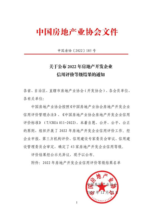 2022年12月27日,中國房地產(chǎn)業(yè)協(xié)會公布了2022年全國房地產(chǎn)開發(fā)企業(yè)信用評價等級結(jié)果,全國43家房地產(chǎn)開發(fā)企業(yè)經(jīng)嚴格、公正評審后獲評信用等級。集團泰和置業(yè)榮獲此次信用評價的最高等級——AAA級,這也是泰和置業(yè)繼2016年、2019年獲評AAA級后,再次獲得國家權(quán)威機構(gòu)的肯定。作為衡量一家企業(yè)綜合實力的重要指標,企業(yè)AAA信用評級具有極高“含金量”。依據(jù)對評估對象的信用紀錄、履約能力、經(jīng)營狀況以及專家實地核驗等多項指標的科學評估與認證,企業(yè)信用等級越高,代表其經(jīng)營狀況、履約行為、信用紀錄越良好,是對企業(yè)信譽建設的高度認可。企業(yè)信用評級證書有效期3年,中房協(xié)委托評價機構(gòu)對有效期內(nèi)企業(yè)每年進行信用動態(tài)監(jiān)測。 信用是企業(yè)寶貴的無形資產(chǎn),也是企業(yè)的誠信名片和市場通行證。泰和置業(yè)多次獲評最高信用等級,充分體現(xiàn)了泰和置業(yè)在誠信經(jīng)營方面的重視與堅守,以“品質(zhì)”為基石,嚴格把控產(chǎn)品規(guī)劃設計、建設、銷售和服務的各個環(huán)節(jié),精于勤,作于細,方寸之間,匠心盡顯。同時也說明,集團各參建單位在統(tǒng)一協(xié)調(diào)配合等方面出色和卓越的工作。