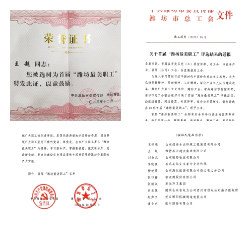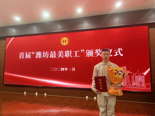 2024年1月19日上午,由市總工會(huì)舉辦的首屆“濰坊最美職工”頒獎(jiǎng)儀式在濰坊市工人文化宮一樓西區(qū)104會(huì)議室隆重舉行。集團(tuán)公司工會(huì)主席穆乃出席頒獎(jiǎng)儀式。在首屆10名最美職工中,集團(tuán)機(jī)施公司維修電工王超獲此殊榮。