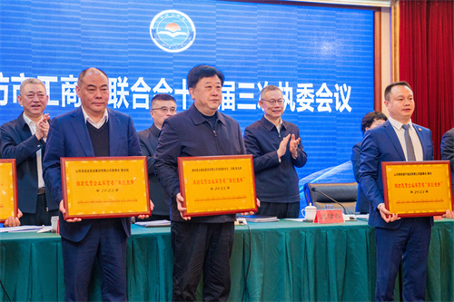 2024年3月22日上午,濰坊市工商聯(lián)十三屆三次執(zhí)委會在金茂國際大酒店召開。集團(tuán)公司總裁朱九洲出席會議并作為濰坊民營企業(yè)家百名“敢創(chuàng)先鋒”代表上臺領(lǐng)獎。