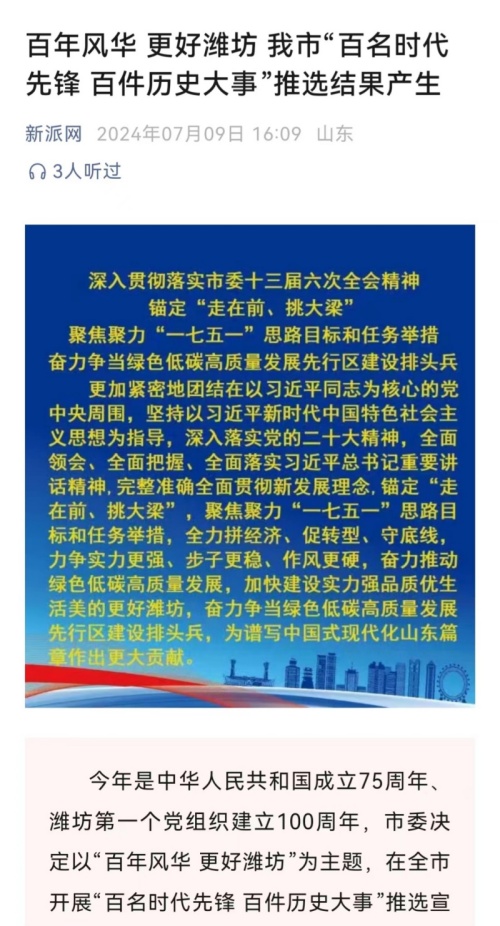 “百名時(shí)代先鋒、百件歷史大事”將進(jìn)一步推動(dòng)全市各級(jí)深入學(xué)習(xí)貫徹習(xí)近平總書記視察山東重要講話精神,按照市委十三屆六次全會(huì)的部署要求,錨定“走在前、挑大梁”,自信自強(qiáng)、開拓創(chuàng)新、敢為爭(zhēng)先、勇毅前行,在新征程新起點(diǎn)上全面提升各項(xiàng)工作檔次水平,奮力推動(dòng)綠色低碳高質(zhì)量發(fā)展,加快建設(shè)實(shí)力強(qiáng)品質(zhì)優(yōu)生活美的更好濰坊,為譜寫中國(guó)式現(xiàn)代化山東篇章作出更大貢獻(xiàn)。