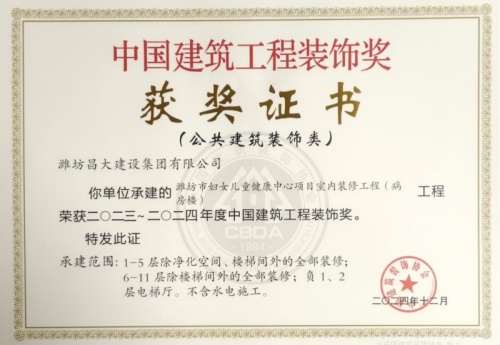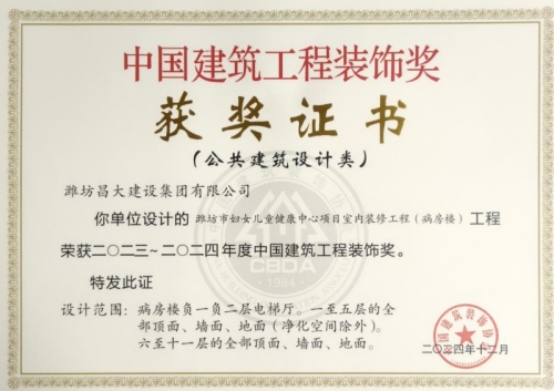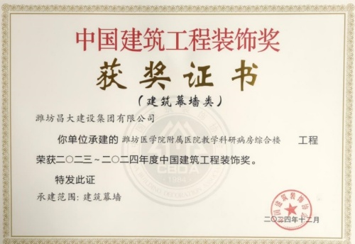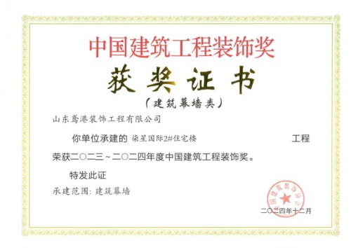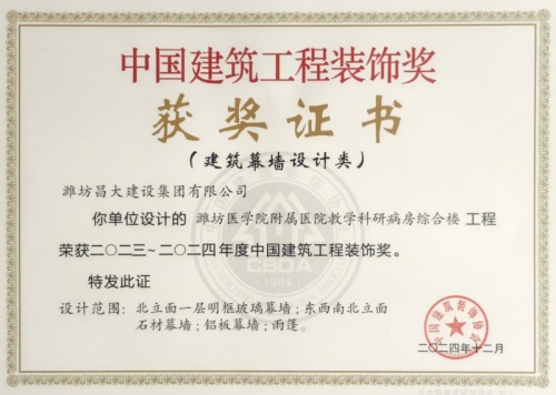 2024年12月10日,中國建筑裝飾協(xié)會在北京召開大會,表彰2023~2024年度“中國建筑工程裝飾獎(jiǎng)”工程。集團(tuán)裝飾幕墻工程公司、山東鳶港裝飾工程有限公司的三項(xiàng)工程榮獲五個(gè)獎(jiǎng)項(xiàng):濰坊醫(yī)學(xué)院附屬醫(yī)院教學(xué)科研病房綜合樓(建筑幕墻類和幕墻設(shè)計(jì)類)、濰坊市婦女兒童健康中心病房樓(公共建筑裝飾類和公共建筑裝飾設(shè)計(jì)類),柒星國際2#住宅樓(建筑幕墻類)。