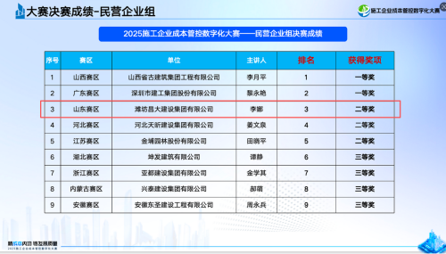 近日,備受建筑行業(yè)關(guān)注的“2025施工企業(yè)成本管控數(shù)字化大賽總決賽暨頒獎典禮”在北京圓滿落幕。集團公司憑借扎實的成本數(shù)字化實踐成果,從全國近三千家參賽企業(yè)中脫穎而出,最終斬獲民營企業(yè)整體排名第三、民營企業(yè)組二等獎的優(yōu)異成績。
